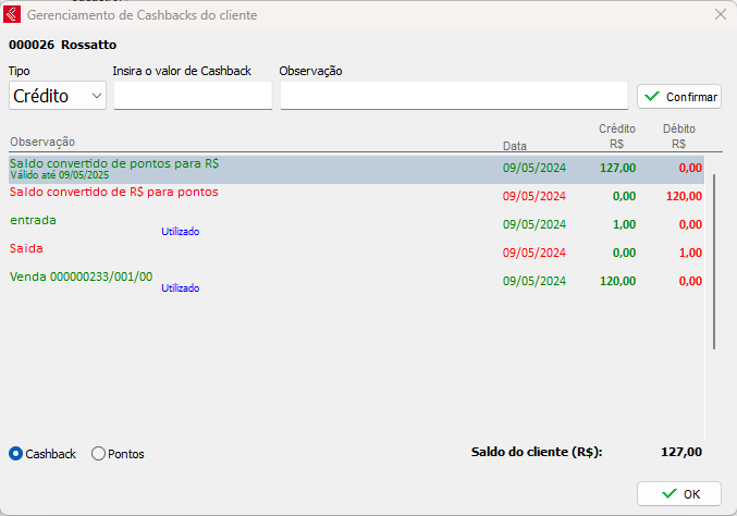 Neste campo apresentará o saldo total, as saídas e entradas de valores e caso for convertido de pontos para valor ou vice-versa, apresentará também, conforme demonstra a imagem.