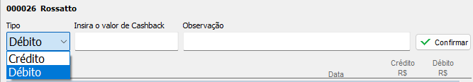 Para adicionar um valor, utilize o tipo Crédito, insira o valor de Cashback e caso queira deixar uma observação, poré ser incluso, após preencher os campos poderá clicar em Confirmar.