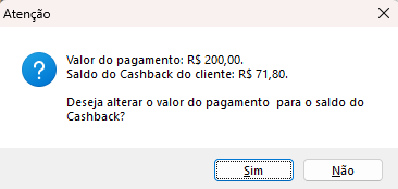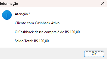 Caso o valor da venda for superior ao valor de cashback total do cliente, apresentará a seguinte informação: