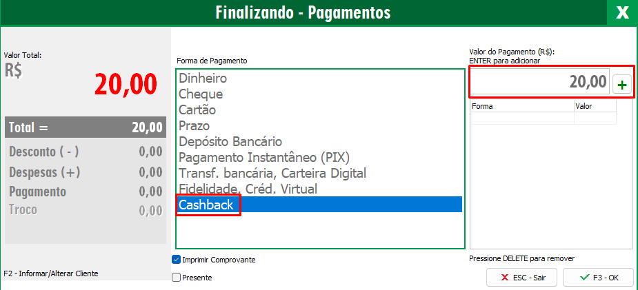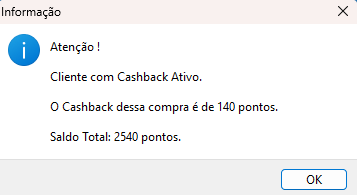 Selecione a forma de pagamento que deseja, e finalize a venda, Ao finalizar a venda, será apresentada a janela de informações do cashback, alertando que o cliente possui cashback ativo, o valor do cashback gerado nesta venda e o saldo que o cliente tem no total.