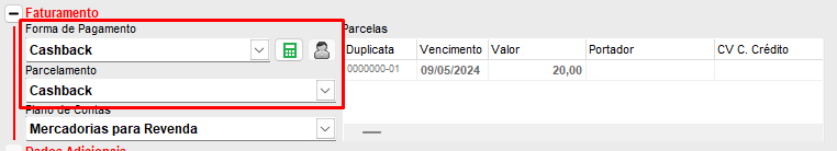 Ao finalizar a NFe, será necessário informar o faturamento da nota fiscal, neste campo será informado a utilização do cashback.