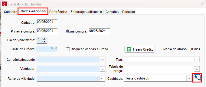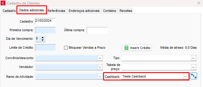 Agora é necessário selecionar qual o cliente que terá cashback, acesse o cadastro do cliente que deseja, e vá na aba de Dados adicionais, E no campo de Cashback, selecione a opção de cashback no qual foi cadastrado.