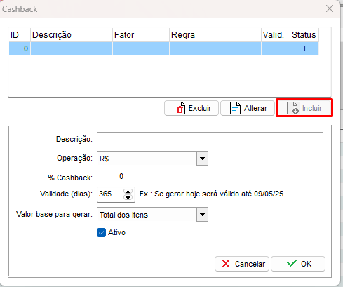- Valor base para gerar: Selecionar se a %Cashback será em base no valor dos itens ou no valor total da nota.