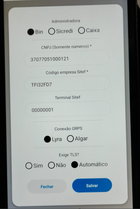 Após isso deverá ser informado a Administradora, CNPJ da empresa proprietária, Código da loja, Terminal (padrão são 7zeros +1) - Conexão GPRS Lyra (chip fiserv) ou Algar (chip vivo) - Exige TLS (padrão deixar automático)