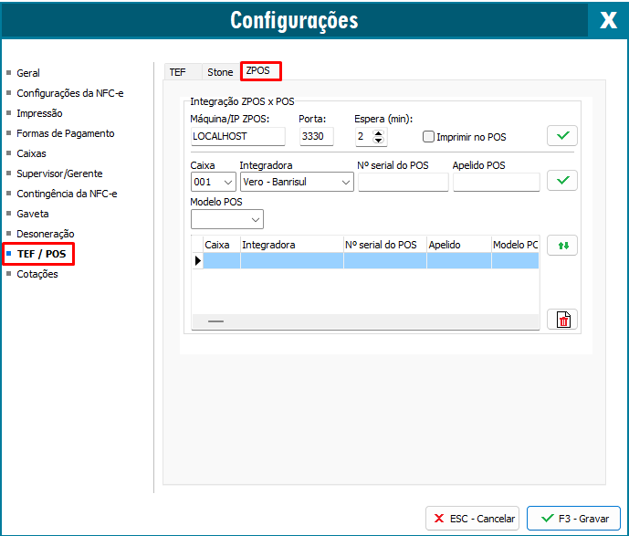 Vá na aba de TEF/POS e acesse a aba de ZPOS.