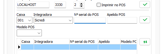 No campo de Integradora selecione Sicredi, preencha o número de série do equipamento e ao lado selecione modelo do equipamento