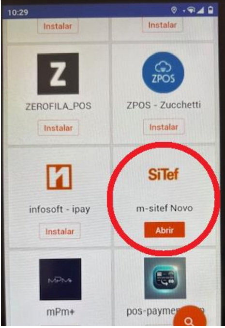 Acessando a loja de aplicativos da maquininha é possivel localizar o app M-Sitef Novo, este aplicativo precisa estar instalado e atualizado para a utilização do ZPOS.