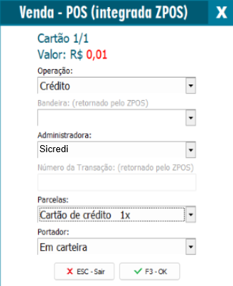 Em Operação selecione a operação se será crédito ou débito, e em administradora selecione a opção de Sicredi, feito isso, basta finalizar a venda!