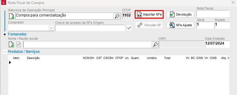 Ao abrir a nota fiscal de compra em branco, acesse a opção Importar NFe.