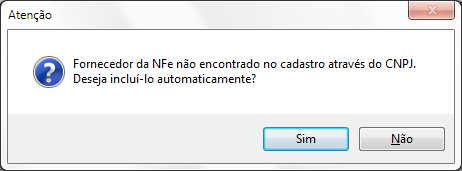 OBS: Caso o fornecedor não esteja cadastrado no seu sistema, será apresentada a mensagem abaixo, solicitando a inclusão do mesmo, clique no botão Sim para prosseguir.