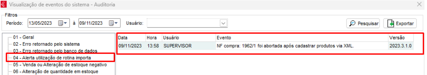 Quando houver importação de XML com cadastro de produtos, e o user desistir do processo, vai mostrar uma mensagem informando que foram cadastrados produtos e pedindo se ele deseja realmente abandonar o processo, se sim, vai gravar um registro na auditoria. Em cadastros - funcionários - exibir - eventos de auditoria;