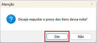 Se por ventura no sistema estiver marcada a opção para solicitar reajuste de preço na compra, abrirá a seguinte mensagem: