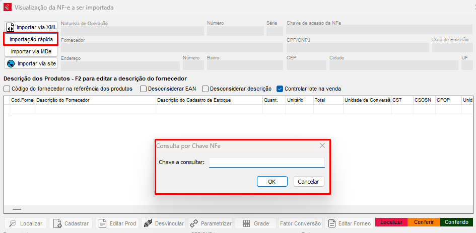 Após isso apresentará a opção de Importação Rápida, com isso irá solicitar a chave de acesso da nota fiscal de compra no qual será importada para o sistema, após o preenchimento, pressione OK.