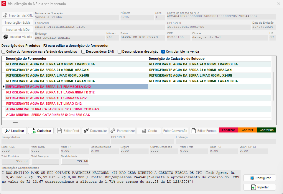 Com os dados corretos, poderá Importar a nota fiscal de compra, conferir todos os dados da Nota de Compra e Finalizar a mesma.