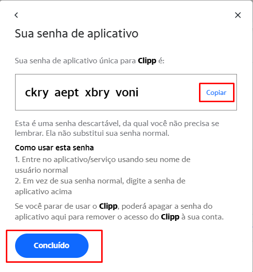 Em seguida será gerada a senha, copie a senha e clique no botão Concluído.