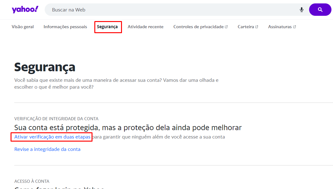 2. Em seguida vá na aba Segurança e clique em Ativar verificação em duas etapas;