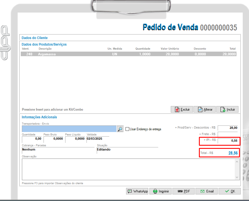 Em seguida abra uma nova DAV e informe o produto que foi preenchido, verifiquei que o valor de IPI é calculado e somado ao valor da DAV.