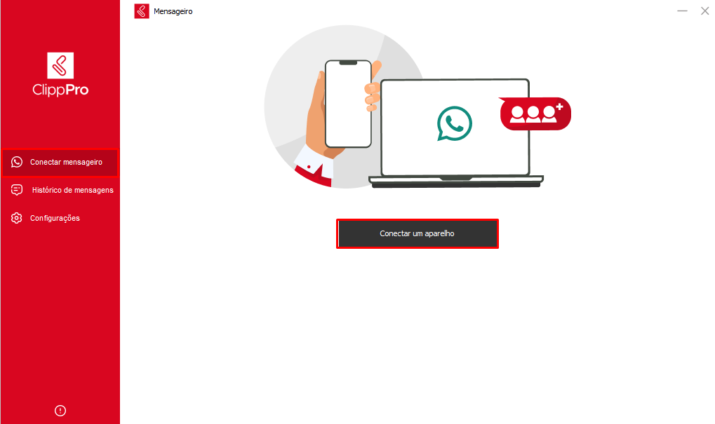 Para conectar um aparelho ao Mensageiro clique na aba "Conectar Mensageiro" e clique em "Conectar Aparelho":