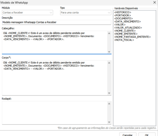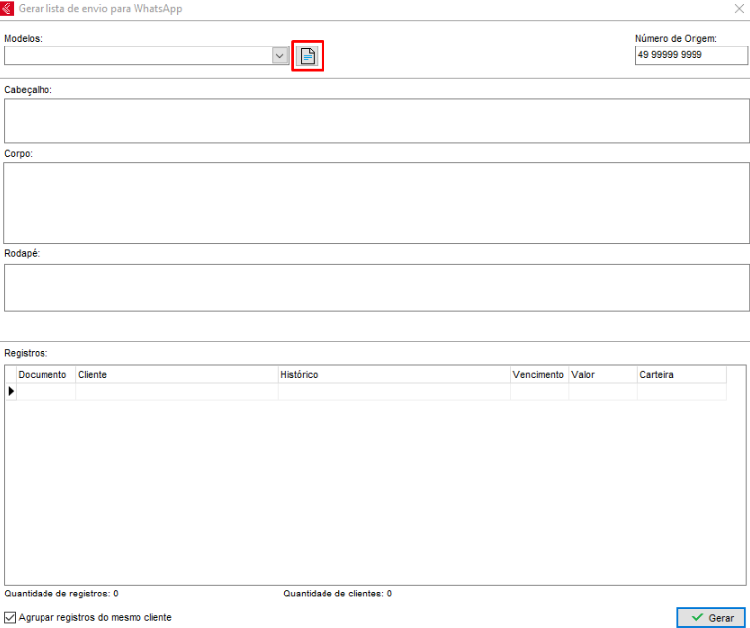Com a função de Agrupar Registros do mesmo cliente marcada, o sistema não irá agrupar todas as informações em uma única mensagem. Em vez disso, ele enviará uma mensagem individual para cada conta simultaneamente. Dessa forma, é realizada apenas uma requisição ao mensageiro, em vez de diversas contas separadas.