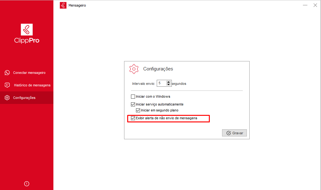 Marcando a opção de “Exibir alerta de não envio de mensagens”, ao tentar enviar uma mensagem e não conseguir enviar por algum motivo, será apresentada uma notificação do windows para ter conhecimento deste não envio da mensagem: