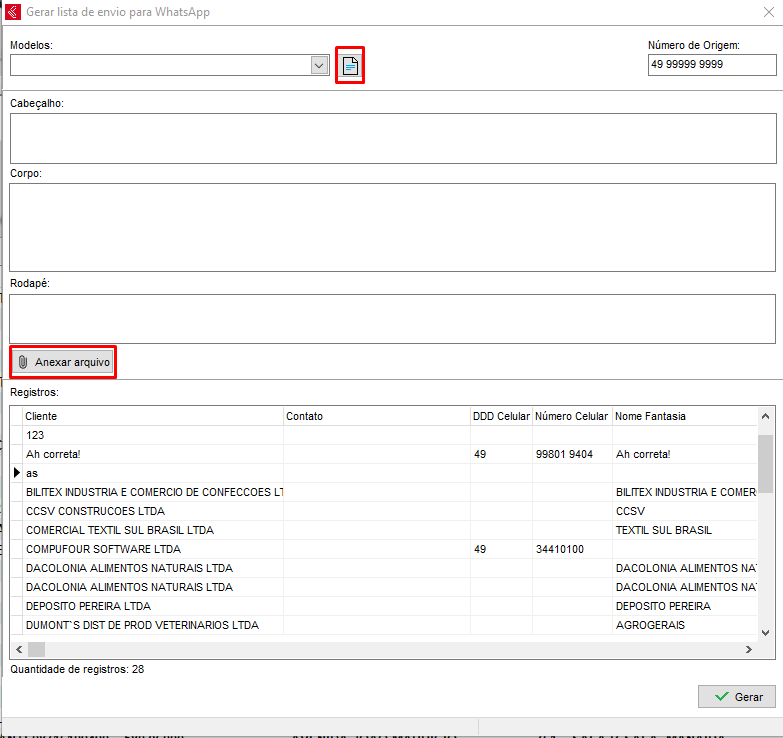 Agora também é possível utilizar o envio no módulo de cadastro de clientes, a opção de enviar mensagem para clientes cadastrados, então basta filtrar os clientes que deseja, ir no menu de Arquivos > Gerar lista de envio WhatsApp