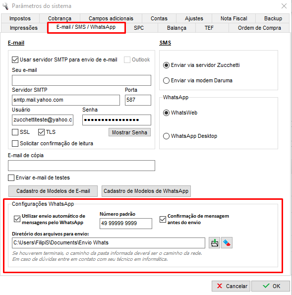 Após acessar Parâmetros, vá até a aba E-mail/SMS/Whatsapp, nessa aba deve marcar a opção de "Utilizar envio automático de mensagens pelo Whatsapp", preencher o Número padrão de envio, e também é necessário selecionar a pasta onde os arquivos enviados serão salvos, nesse caso indicamos criar uma pasta nos Documentos com o nome de "Envio Whats".