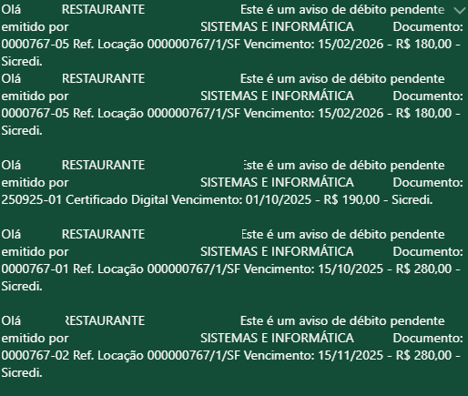 A função também se faz presente no módulo de contas a receber, é possível enviar mensagens para os clientes com as contas filtradas.
