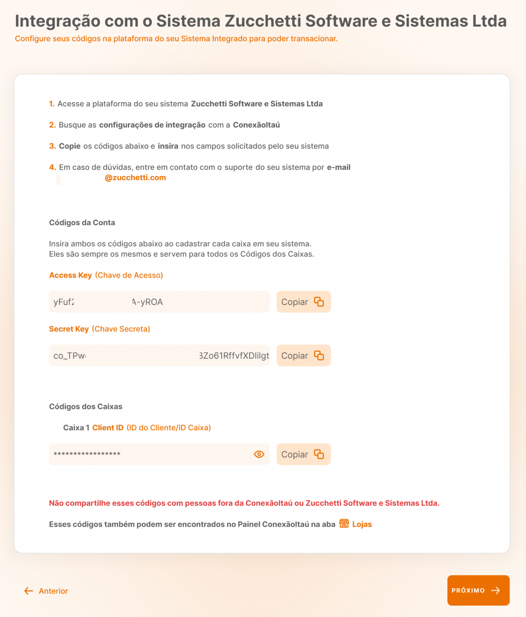 Na próxima janela, serão apresentadas as credenciais para utilização da Integração Itaú.