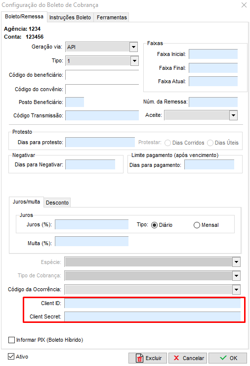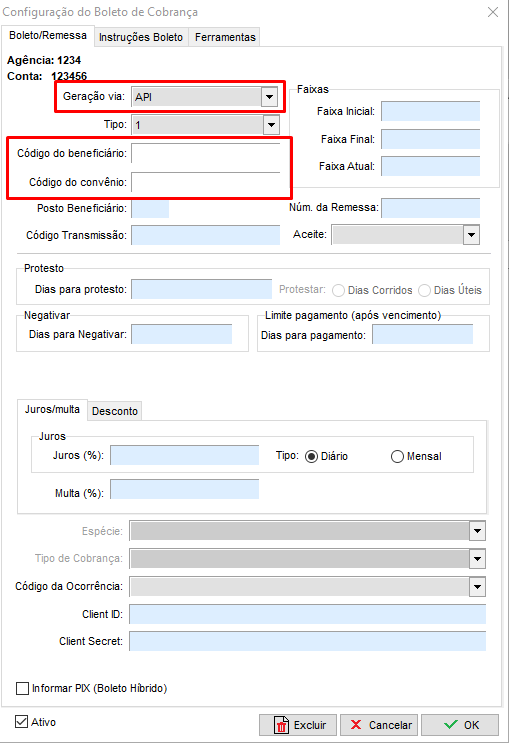 Após isso marque a Geração Via API e preencha os demais campos informados abaixo.