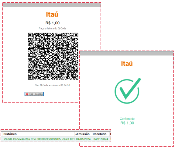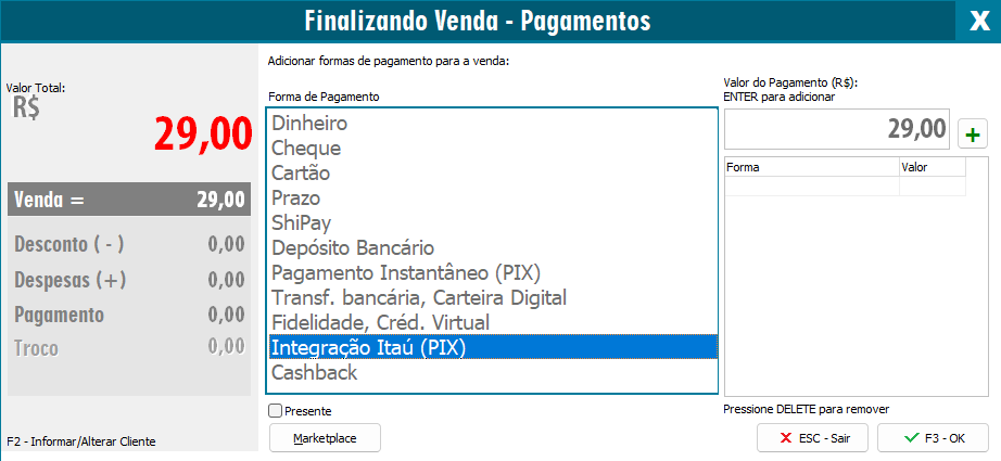 Na janela de Forma de Pagamento, você encontra a opção de Integração Itaú (PIX), selecionando esta forma de pagamento, será gerado o QR Code em tela.