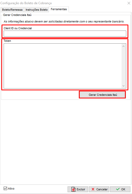 Em seguida acesse a aba de Ferramentas, nela deve ser informados o ClientID e o Token repassados pelo banco, em seguida clique em Gerar Credenciais Itaú.