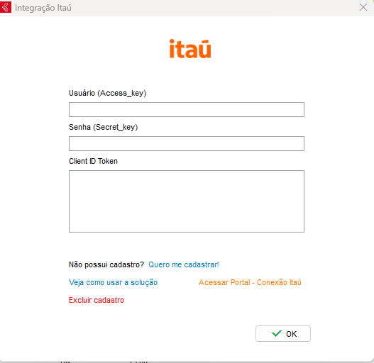 Caso o cliente já possua as chaves, basta preencher as mesmas nos campos de: Usuário (Access_key), Senha (Secret_key) e Client ID Token.