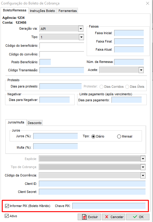 Caso deseje gerar o boleto com QR Code pix, é necessário marcar a opção de “Informar PIX (Boleto híbrido)” e preencher a chave.