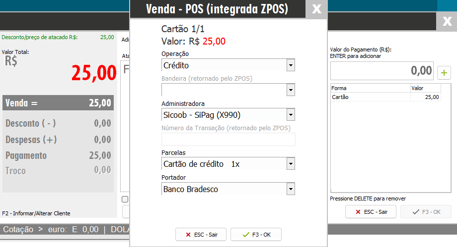 Finalize como cartão, Venda - POS (integrada ZPOS), selecione a administradora cadastrada e clique em OK, uma nova tela será apresentada