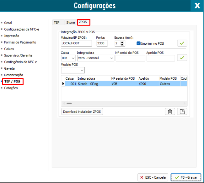 Para a configuração, acesse o NFC-e. F10 - Menu > TEF/POS > ZPOS e preencha as informações