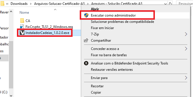 Dentro da pasta extraida, clique com o botão direito no InstaladorCadeias_1.0.2.0 e selecione Executar como administrador.