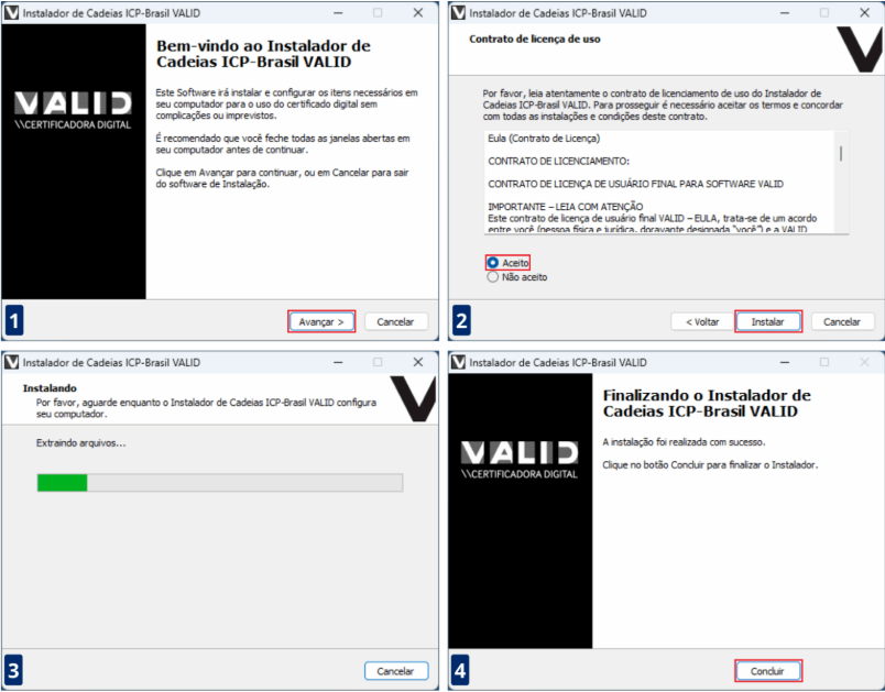 Depois clique em Avançar marque a opção Aceito e após isso Instalar, aguarde a instalação e clique em Concluir.