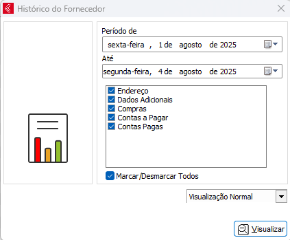 Ao gerar esse relatório, o mesmo será gerado para o fornecedor da conta selecionada no momento, com informações de Endereço, Dados Adicionais, Compra, Contas à Pagar e Contas Pagas.