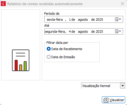 No relatório, as contas recebeidas automaticamente serão geradas de acordo com o período informado, pode ser gerado pela Data de Recebimento da conta ou pela Data de Emissão do documento. Apenas documentos com a forma de pagamento Cartão e com o parcelamento devidamente cadastrado serão inseridos, para configuração, clique aqui.