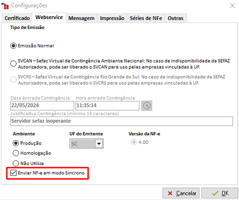 Pressione em Opções > Configurar > WebService > Enviar NF em modo Síncrono: