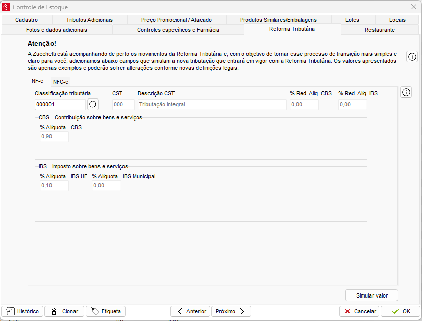 Os campos da nova tributação serão preenchidos automaticamente com base no cadastro do item na aba NFC-e.