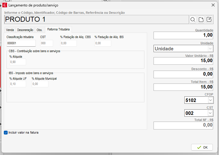 No lançamento de produtos, estarão visíveis os campos da nova tributação.