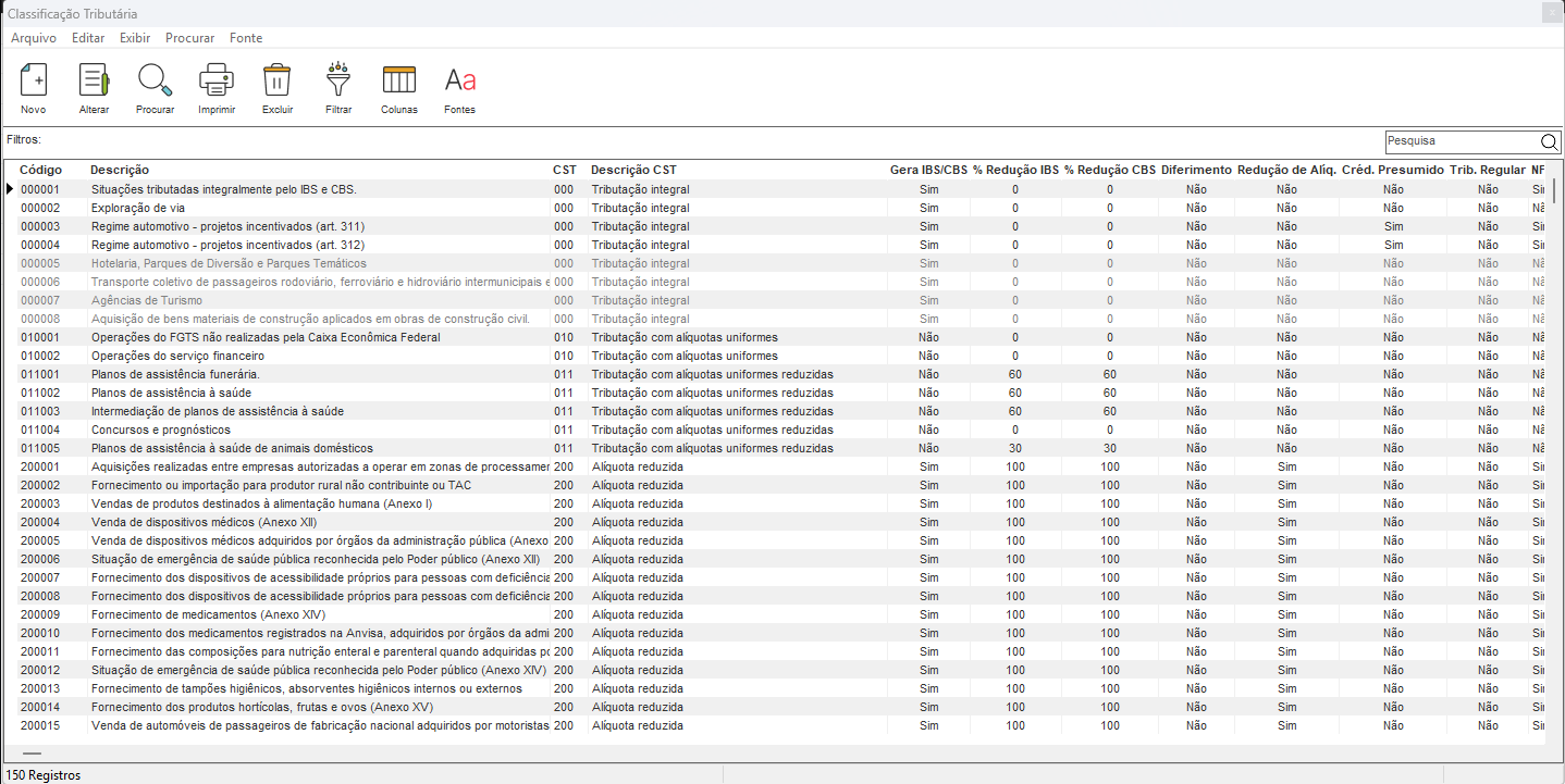 A tela principal apresenta um grid com as classificações tributárias cadastradas, permitindo realizar operações de inclusão, edição, exclusão e pesquisa.