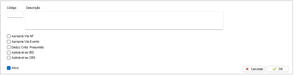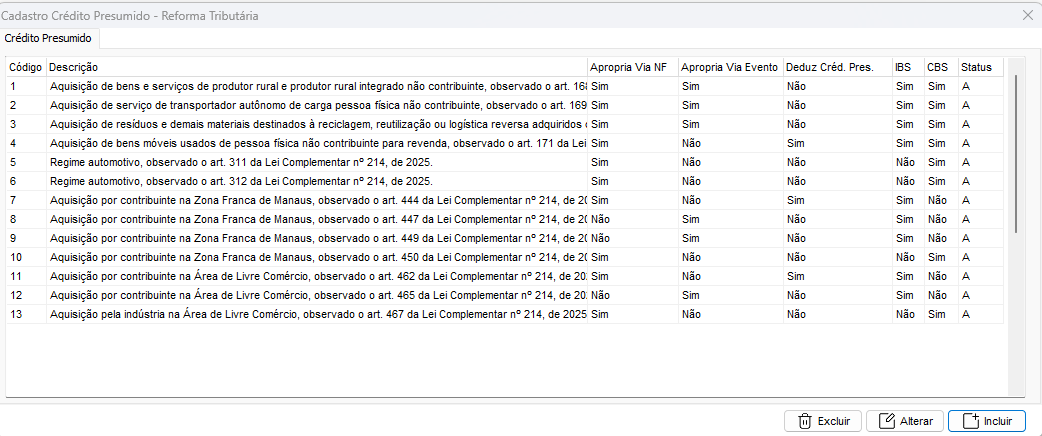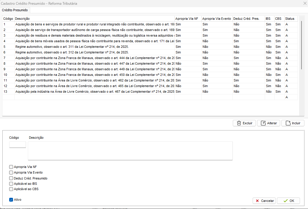 Tela específica para inclusão e edição de códigos de crédito presumido, com base na tabela da SEFAZ.