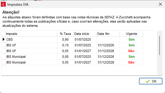 Configurações > Reforma Tributária > Alíquotas e Vigências