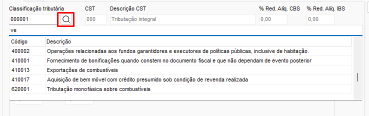 - Ao lado do campo, é possível consultar a tabela de códigos, pesquisando pelo código ou pela descrição. Após preencher a Classificação Tributária, os demais campos serão liberados.