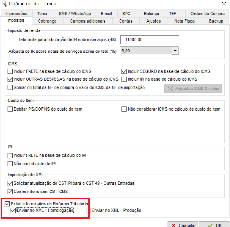 - Marque a opção “Exibir informações da Reforma Tributária”.
