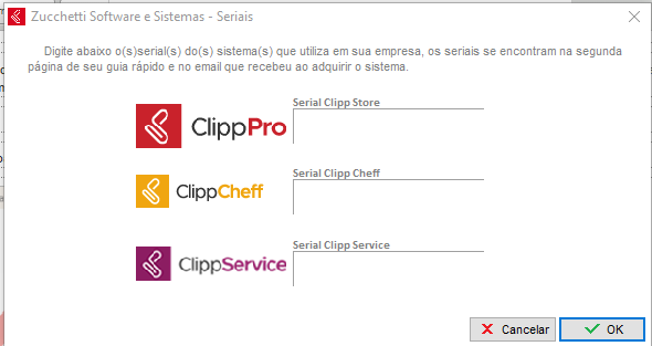 Caso tenha adquirido algum módulo complementar (ClippCheff ou ClippService) será instalado junto ao instalador do ClippPro. Após finalizar a instalação conforme o artigo de instalação clicando aqui, basta informar o serial do módulo complementar após o sistema abrir pela primeira vez quando finalizado a instalação.