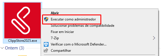 OBS: Caso apresentar qualquer situação ou mensagem durante o processo de instalação, cancele e feche todas as janelas. Acesse o CD ou local do arquivo baixado do site, clique com o botão direito do mouse sobre o instalador do ClippPro (ClippStore2025.exe) e então clique na opção Executar como Administrador e inicie o processo novamente.