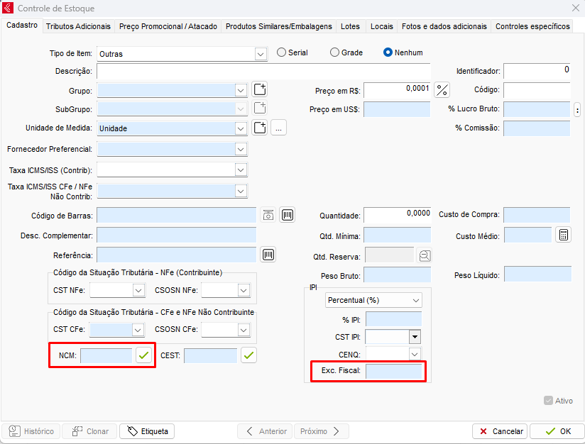 IMPORTANTE: Verifique com sua contabilidade qual o código NCM será utilizado e caso necessário qual Exceção Fiscal (EF) deve ser preenchida.